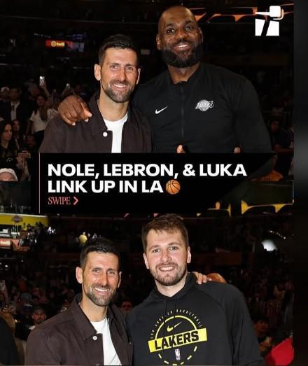 昨天,湖人主场128-104战胜了国王。男子网球获大满贯数第一的德约科维奇也到场观看了这场比赛,今天他也在社媒晒出了与詹姆斯和东契奇的合照。